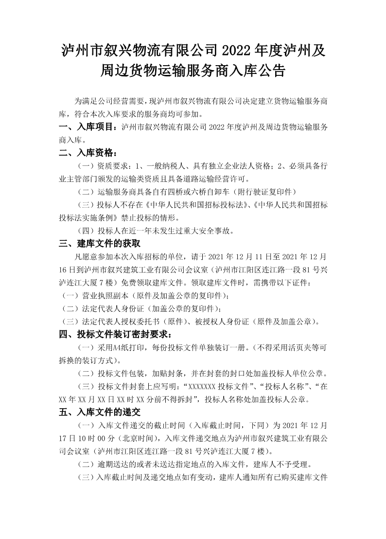 瀘州市敘興物流有限公司2022年度瀘州及周邊貨物運輸服務商入庫公告