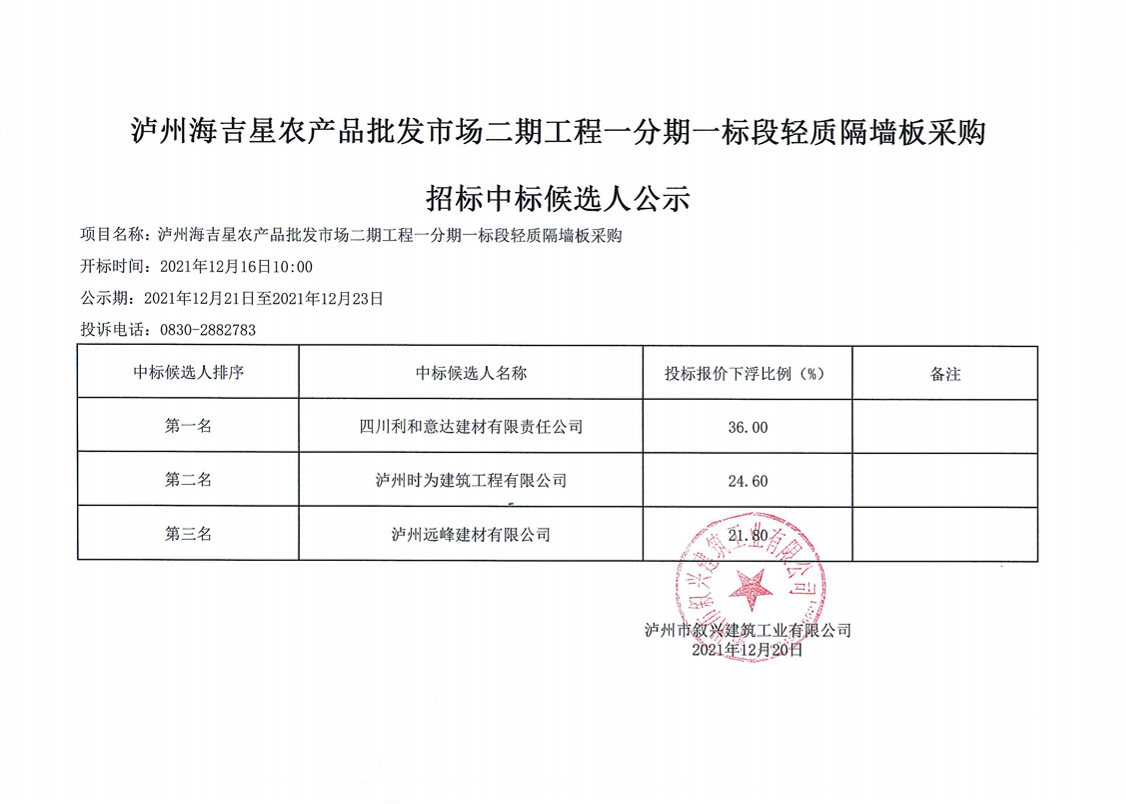 瀘州海吉星農(nóng)產(chǎn)品批發(fā)市場(chǎng)二期工程一分期一標(biāo)段輕質(zhì)隔墻板采購(gòu)招標(biāo)中標(biāo)候選人公示 作者: 來(lái)源: 日期:2021-12-20 瀏覽次數(shù): 次 【字體:小 大】 【打印正文】