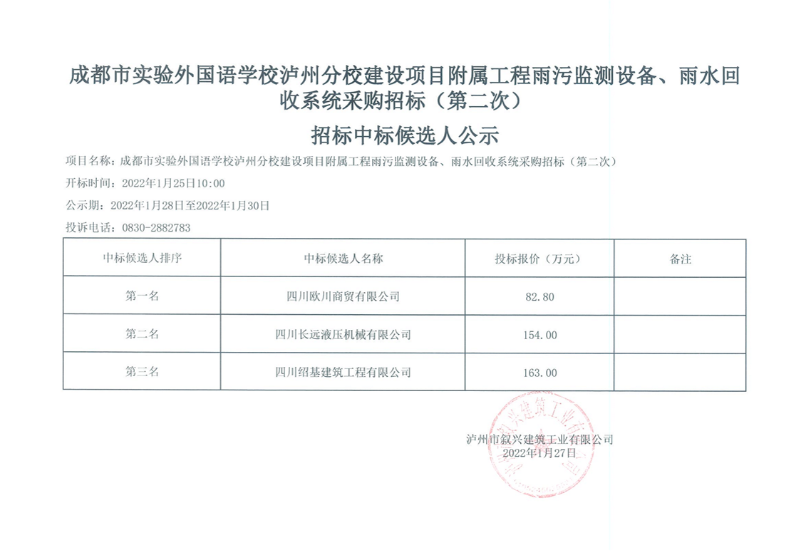 成都市實(shí)驗(yàn)外國(guó)語(yǔ)學(xué)校瀘州分校建設(shè)項(xiàng)目附屬工程雨污監(jiān)測(cè)設(shè)備、雨水回收系統(tǒng)采購(gòu)招標(biāo)(第二次)中標(biāo)候選人公示