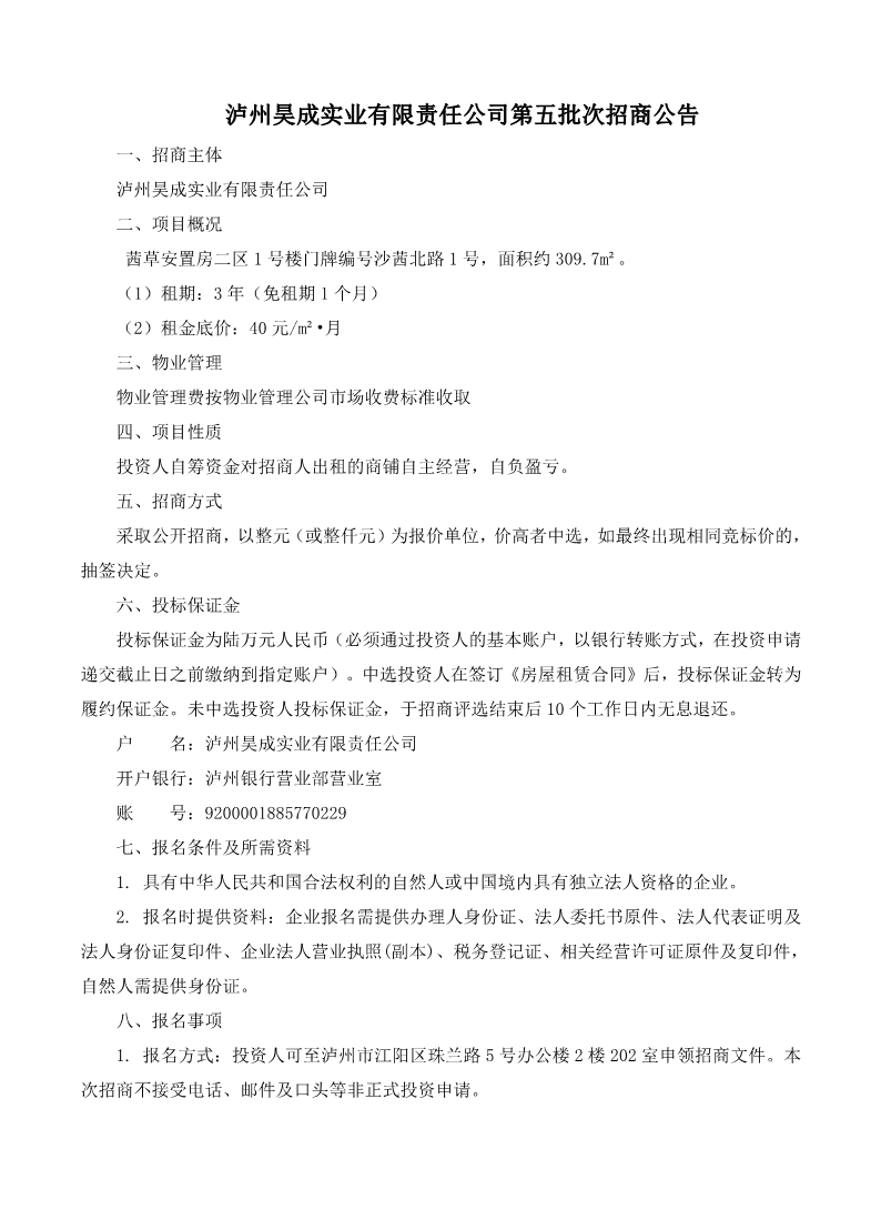 瀘州昊成實(shí)業(yè)有限責(zé)任公司第五批次招商公告