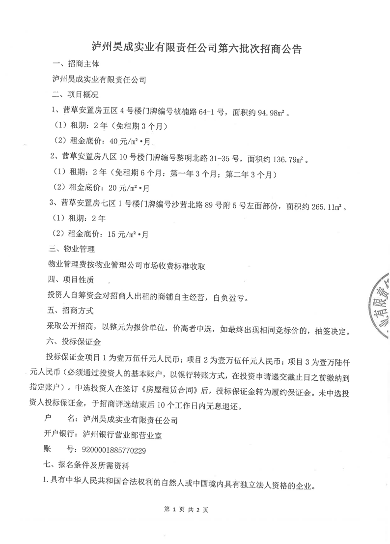瀘州昊成實業(yè)有限責任公司第六批次招商公告