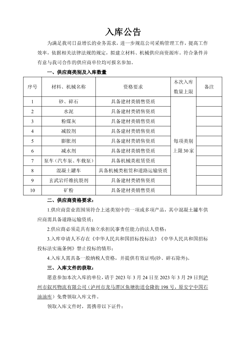 瀘州市敘興物流有限公司材料、機(jī)械供應(yīng)商入庫(kù)公告