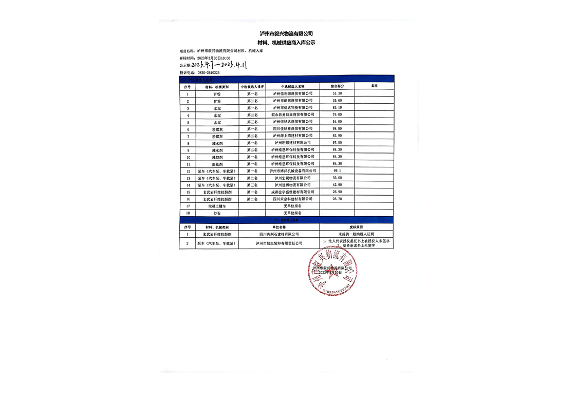 瀘州市敘興物流有限公司材料、機(jī)械供應(yīng)商入庫公示