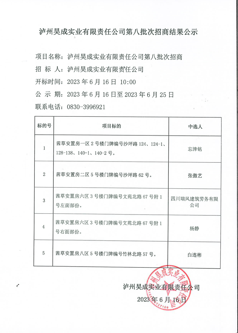 瀘州昊成實(shí)業(yè)有限責(zé)任公司第8批次招商結(jié)果公示