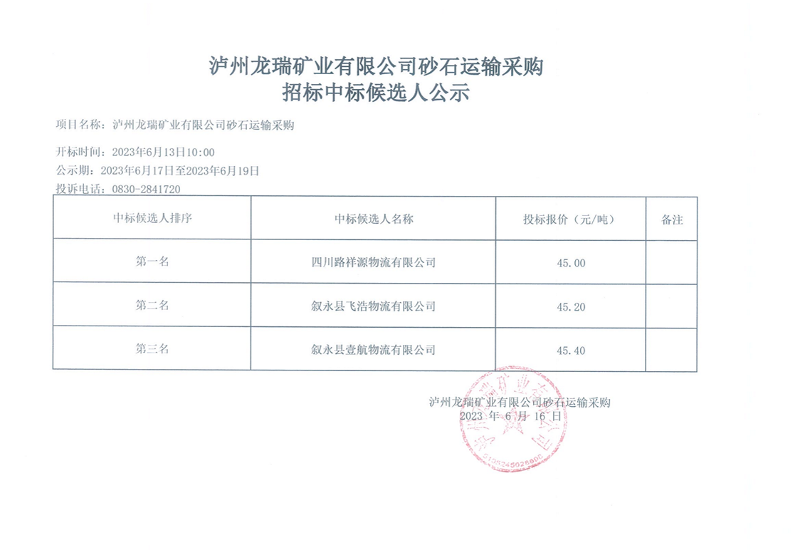 瀘州龍瑞礦業(yè)有限公司砂石運輸采購招標中標候選人公示