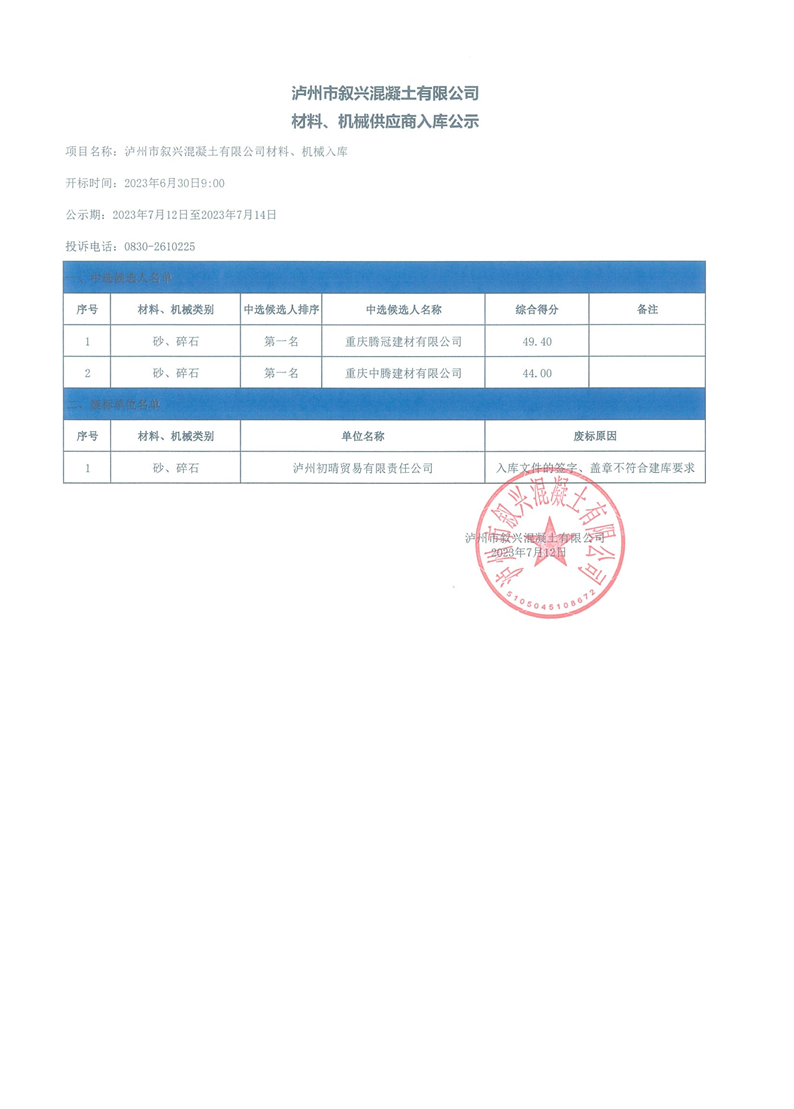 瀘州市敘興混凝土有限公司材料、機(jī)械供應(yīng)商入庫公示
