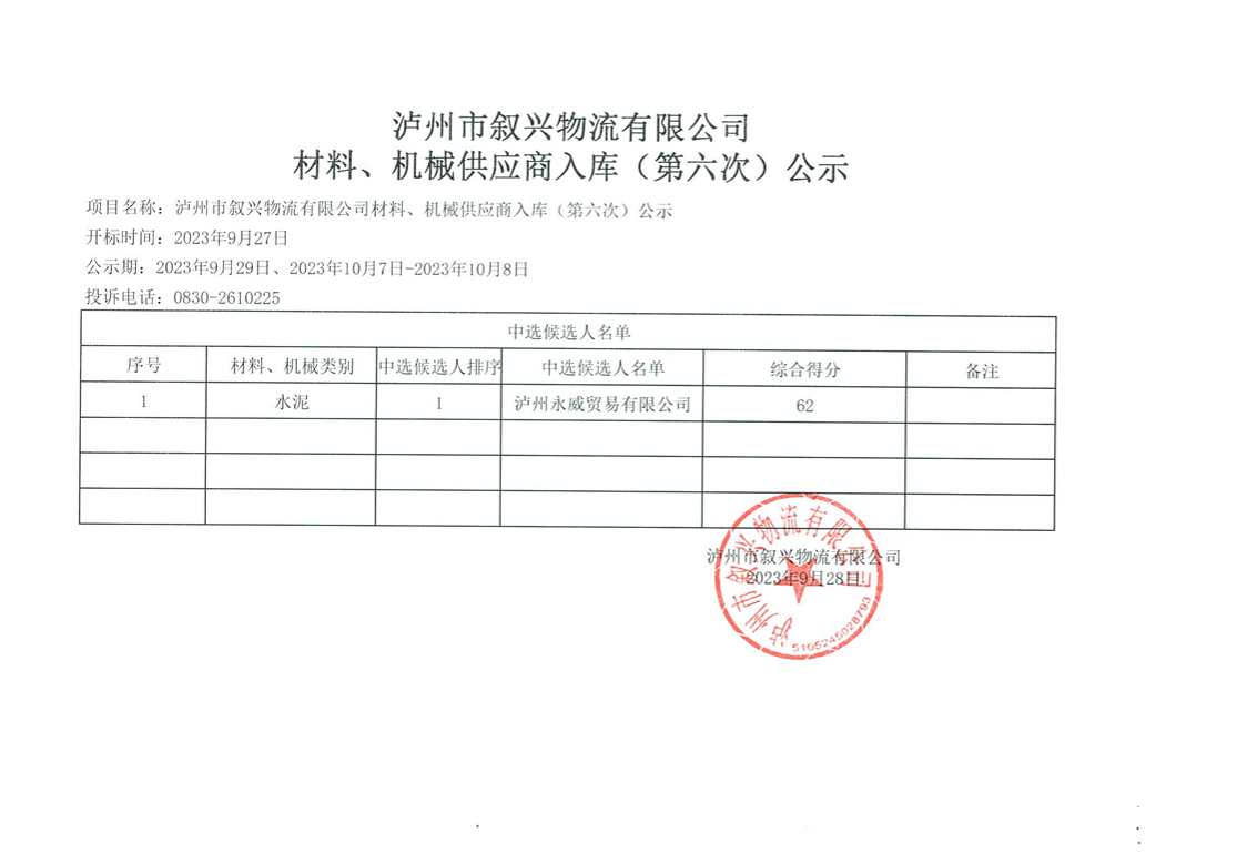 瀘州市敘興物流有限公司材料、機(jī)械供應(yīng)商入庫(kù)(第六次)公示