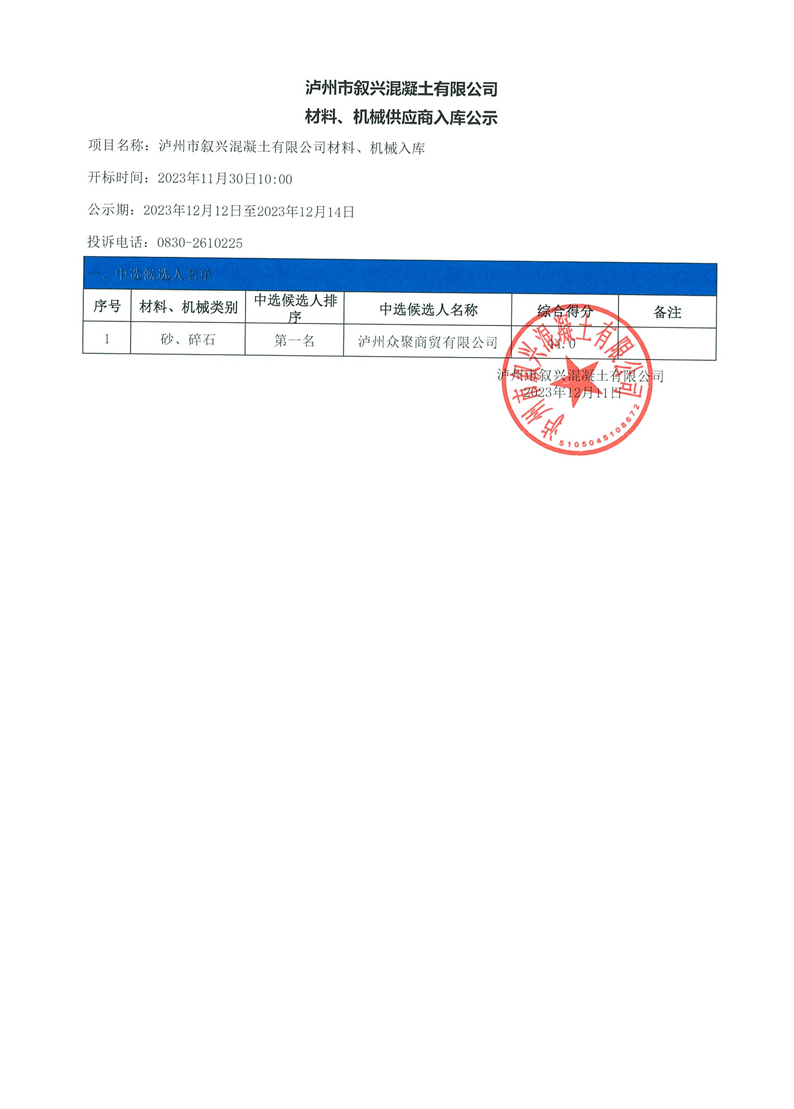 瀘州市敘興混凝土有限公司材料、機(jī)械供應(yīng)商入庫公示