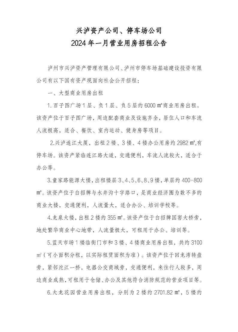 興瀘資產(chǎn)公司、停車場(chǎng)公司2024年一月營(yíng)業(yè)用房招租公告 作者: 來源: 日期:2024-01-15 瀏覽次數(shù): 次 【字體:小 大】 【打印正文】