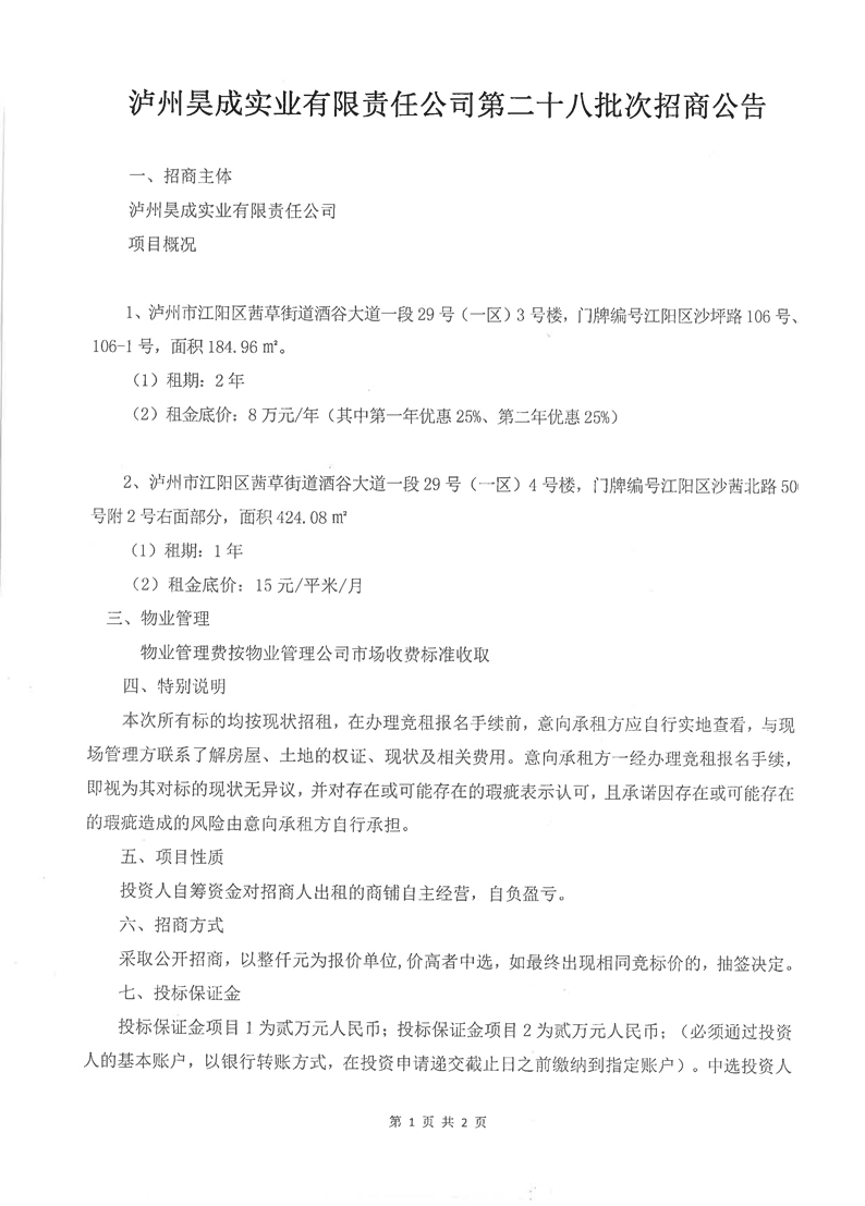 瀘州昊成實(shí)業(yè)有限責(zé)任公司第二十八批次招商公告