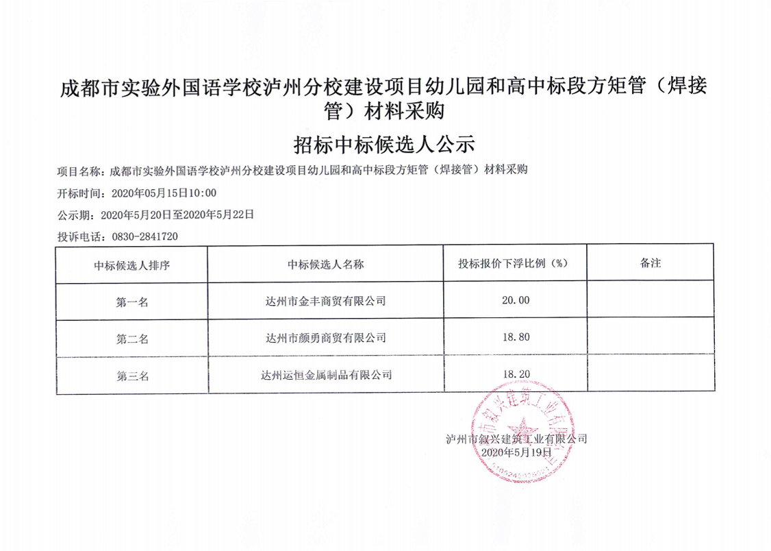 成都市實(shí)驗(yàn)外國(guó)語學(xué)校瀘州分校建設(shè)項(xiàng)目幼兒園和高中標(biāo)段方矩管(焊接管)材料采購(gòu)招標(biāo)中標(biāo)候選人公示