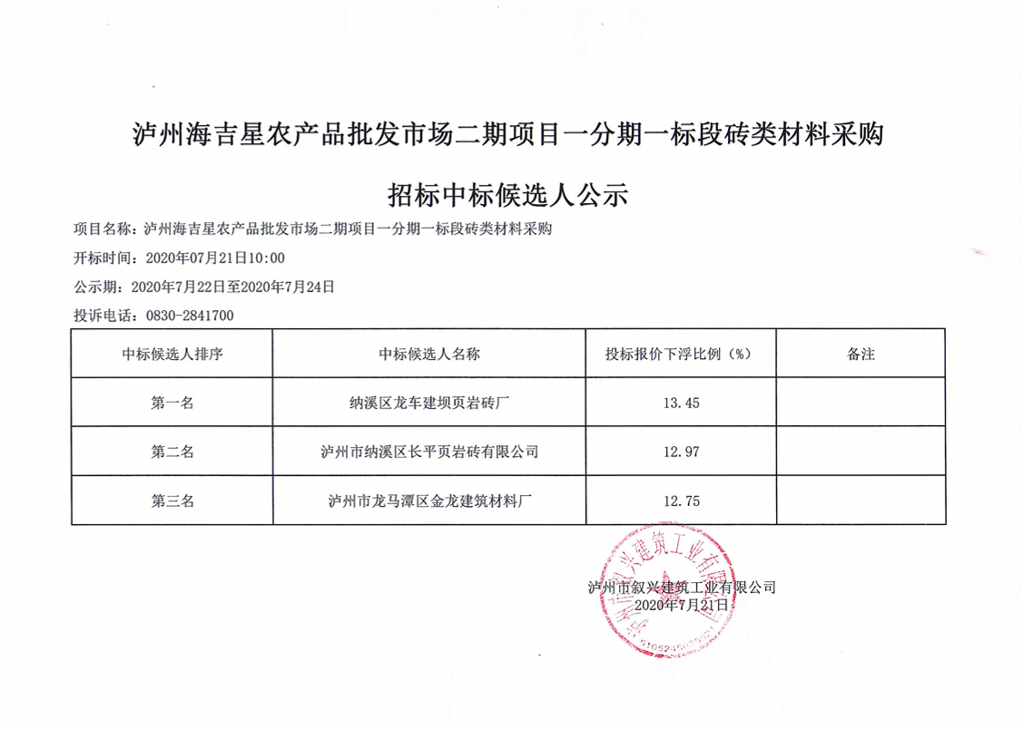 瀘州海吉星農(nóng)產(chǎn)品批發(fā)市場(chǎng)二期項(xiàng)目一分期一標(biāo)段磚類材料采購(gòu)招標(biāo)中標(biāo)候選人公示 作者: 來(lái)源: 日期:2020-07-21 瀏覽次數(shù): 次 【字體:小 大】 【打印正文】