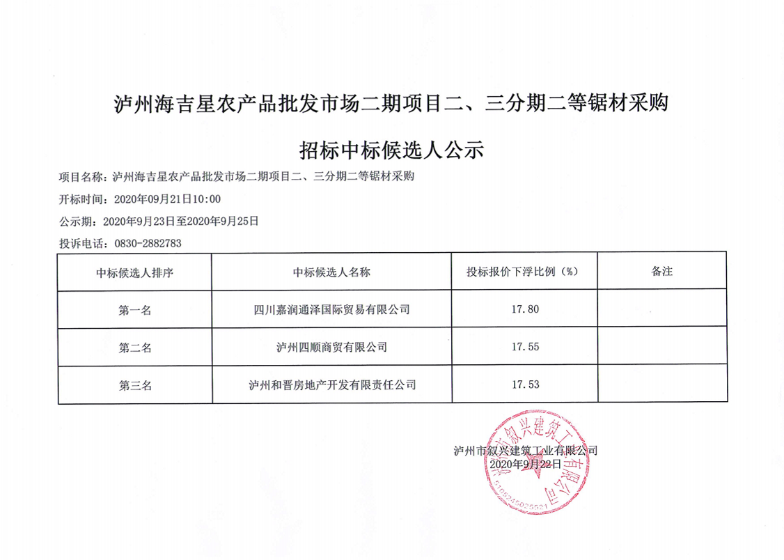 瀘州海吉星農(nóng)產(chǎn)品批發(fā)市場二期項目二、三分期二等鋸材采購招標中標候選人公示 作者: 來源: 日期:2020-09-22 瀏覽次數(shù): 次 【字體:小 大】 【打印正文】