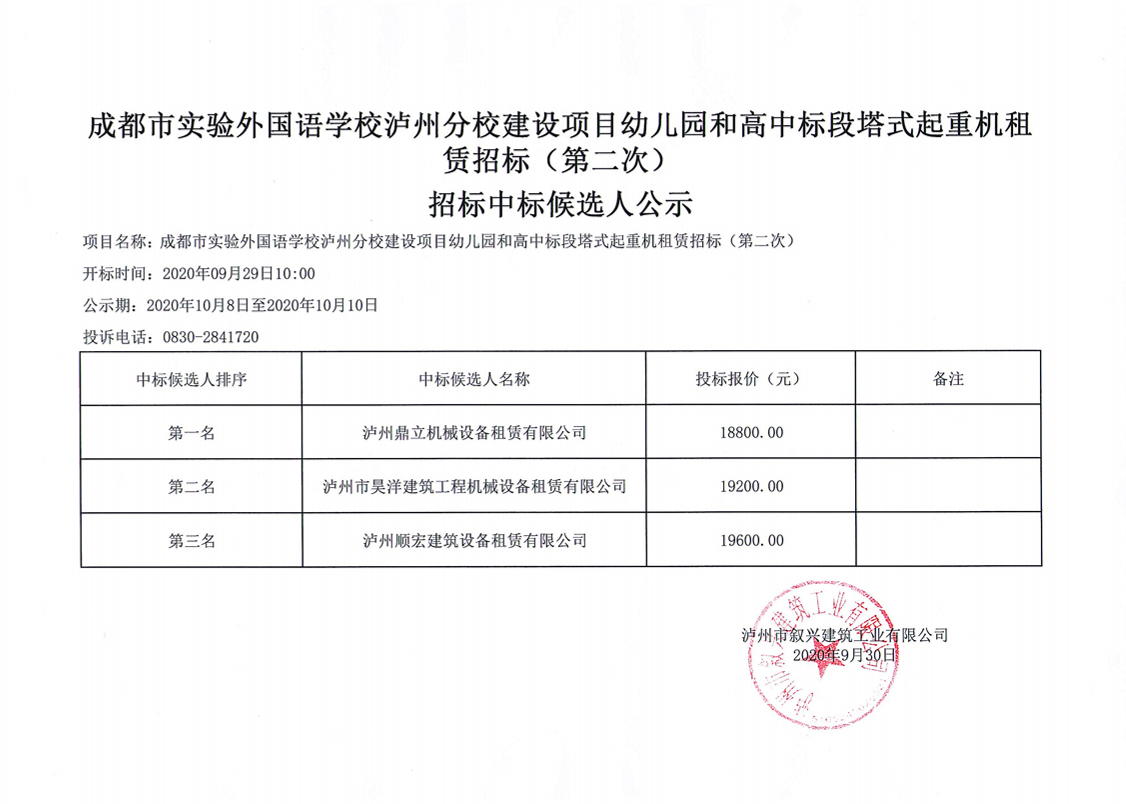 成都市實驗外國語學(xué)校瀘州分校項目幼兒園和高中標(biāo)段塔式起重機租賃招標(biāo)(第二次)中標(biāo)候選人公示 作者: 來源: 日期:2020-09-30 瀏覽次數(shù): 次 【字體:小 大】 【打印正文】