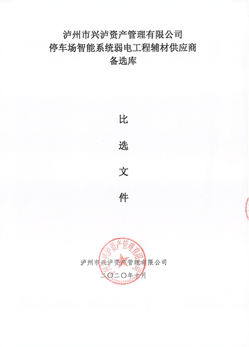 興瀘集團(tuán)旗下瀘州市興瀘資產(chǎn)管理有限公司停車場智能系統(tǒng)弱電工程輔材供應(yīng)商備選庫比選文件 作者: 來源: 日期:2020-10-22 瀏覽次數(shù): 次 【字體:小 大】 【打印正文】