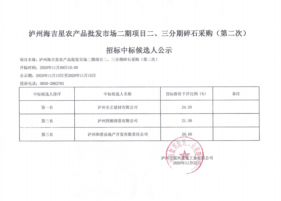 瀘州海吉星農(nóng)產(chǎn)品批發(fā)市場二期項(xiàng)目二三分期碎石采購(第二次)招標(biāo)招標(biāo)候選人公示 作者: 來源: 日期:2020-11-12 瀏覽次數(shù): 次 【字體:小 大】 【打印正文】