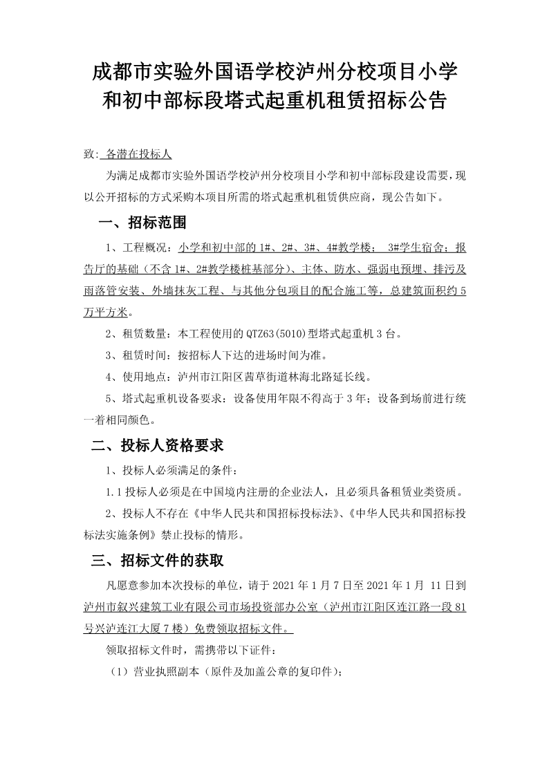 成都市實驗外國語學(xué)校瀘州分校項目小學(xué)和初中部標(biāo)段塔式起重機租賃招標(biāo)公告 作者: 來源: 日期:2021-01-06 瀏覽次數(shù): 次 【字體:小 大】 【打印正文】