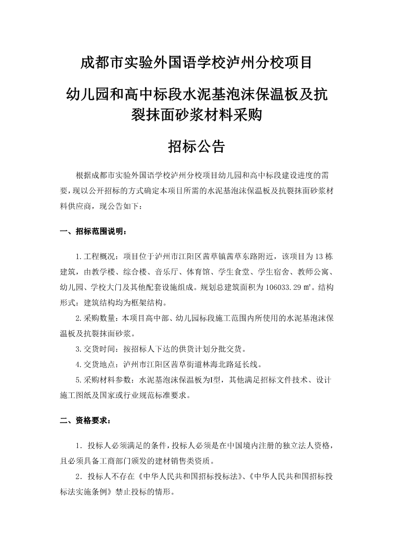 成都市實(shí)驗(yàn)外國語學(xué)校瀘州分校項(xiàng)目幼兒園和高中標(biāo)段水泥基泡沫保溫板及抗裂抹面砂漿材料采購招標(biāo)公告 作者: 來源: 日期:2021-01-06 瀏覽次數(shù): 次 【字體:小 大】 【打印正文】
