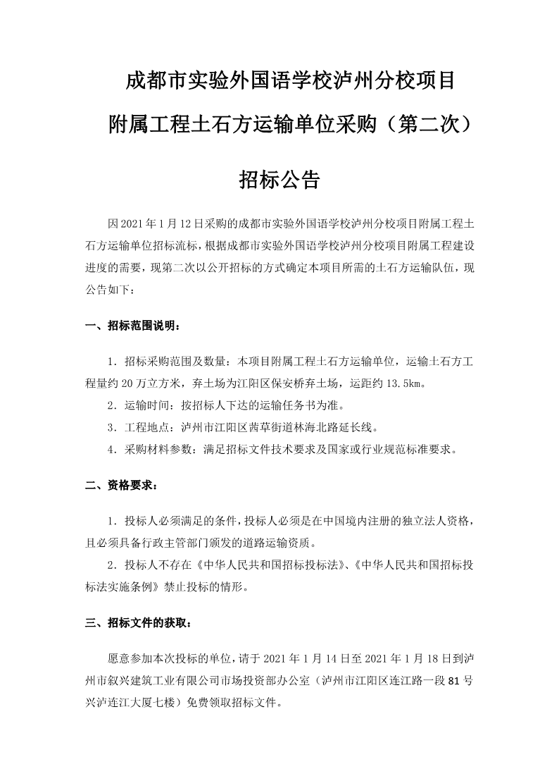 成都市實驗外國語學校瀘州分校項目附屬工程土石方運輸單位采購(第二次)招標公告