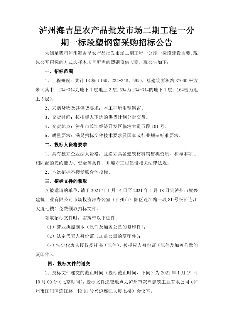 瀘州海吉星農(nóng)產(chǎn)品批發(fā)市場(chǎng)二期工程一分期一標(biāo)段塑鋼窗采購(gòu)招標(biāo)公告 作者: 來(lái)源: 日期:2021-01-13 瀏覽次數(shù): 次 【字體:小 大】 【打印正文】