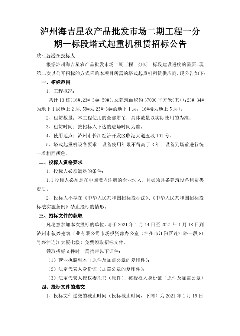 瀘州海吉星農(nóng)產(chǎn)品批發(fā)市場(chǎng)二期工程一分期一標(biāo)段塔式起重機(jī)租賃招標(biāo)公告 作者: 來(lái)源: 日期:2021-01-13 瀏覽次數(shù): 次 【字體:小 大】 【打印正文】