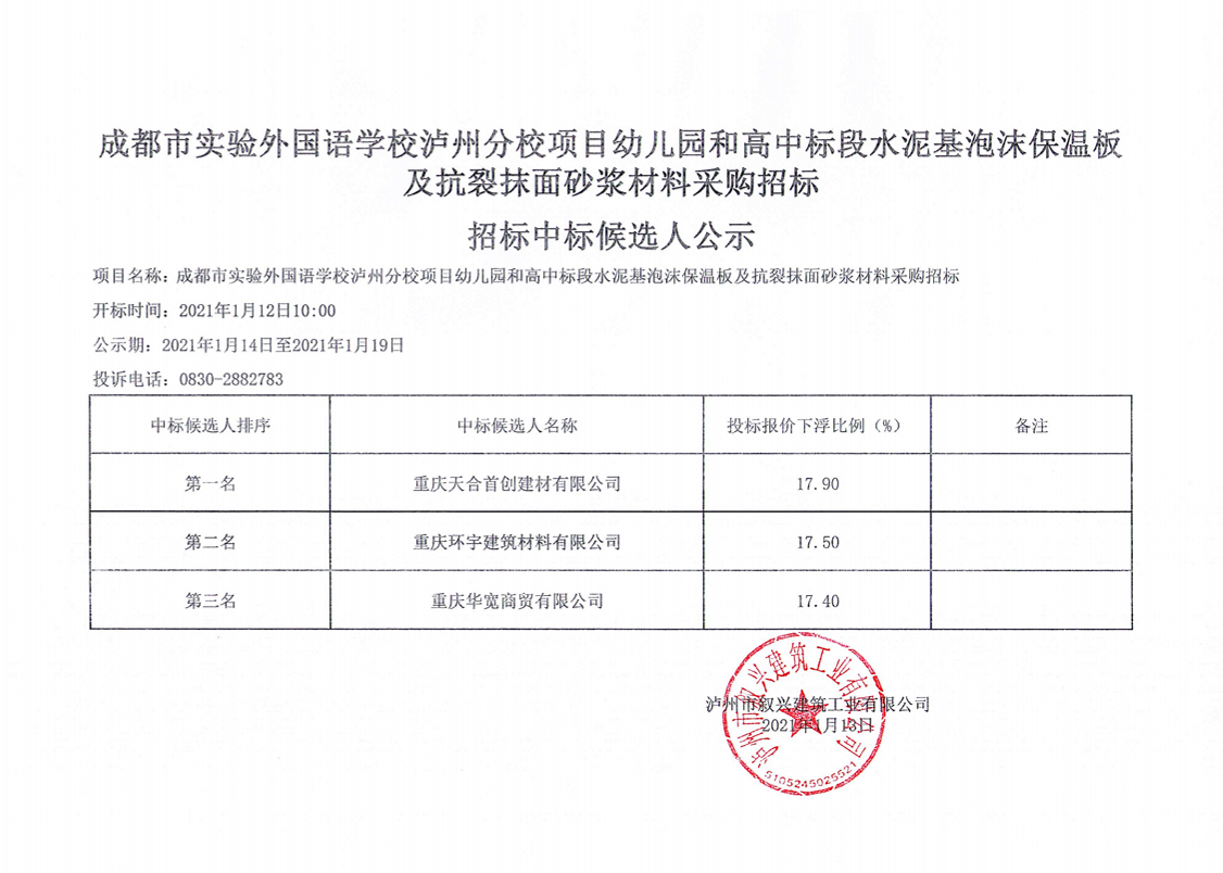 成都市實(shí)驗(yàn)外國(guó)語(yǔ)敘興瀘州分校項(xiàng)目幼兒園和高中標(biāo)段水泥基泡沫保溫板及抗裂抹面砂漿材料采購(gòu)招標(biāo)中標(biāo)候選人公示