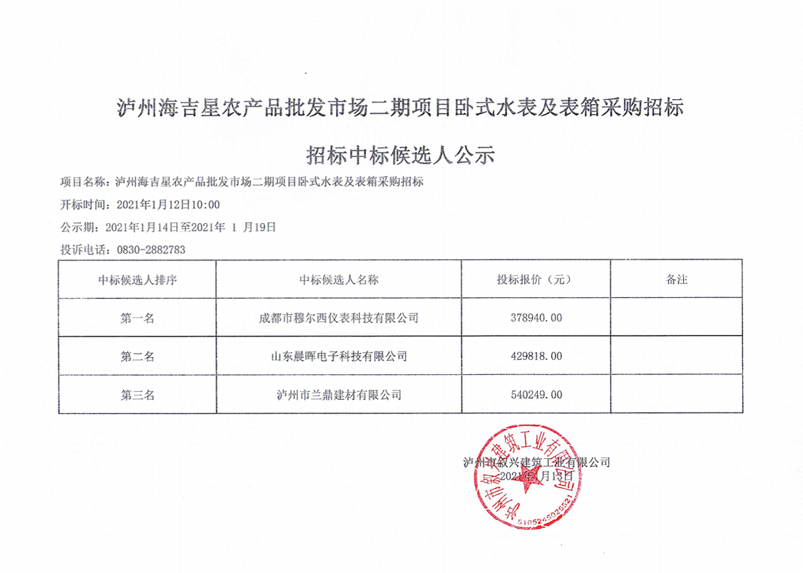 瀘州海吉星農(nóng)產(chǎn)品批發(fā)市場(chǎng)二期項(xiàng)目臥式水表及表箱采購招標(biāo)中標(biāo)候選人公示 作者: 來源: 日期:2021-01-13 瀏覽次數(shù): 次 【字體:小 大】 【打印正文】