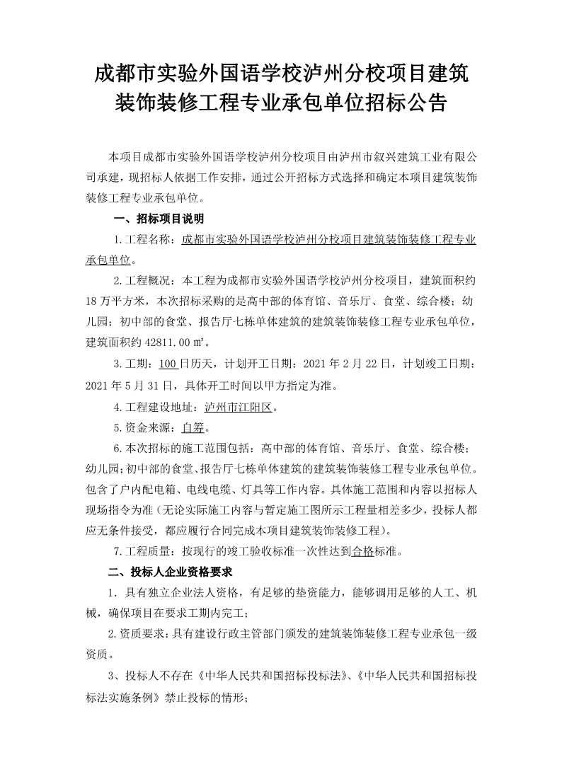 成都市實(shí)驗(yàn)外國(guó)語(yǔ)學(xué)校瀘州分校項(xiàng)目建筑裝飾裝修工程專業(yè)承包單位招標(biāo)公告 作者: 來源: 日期:2021-02-05 瀏覽次數(shù): 次 【字體:小 大】 【打印正文】
