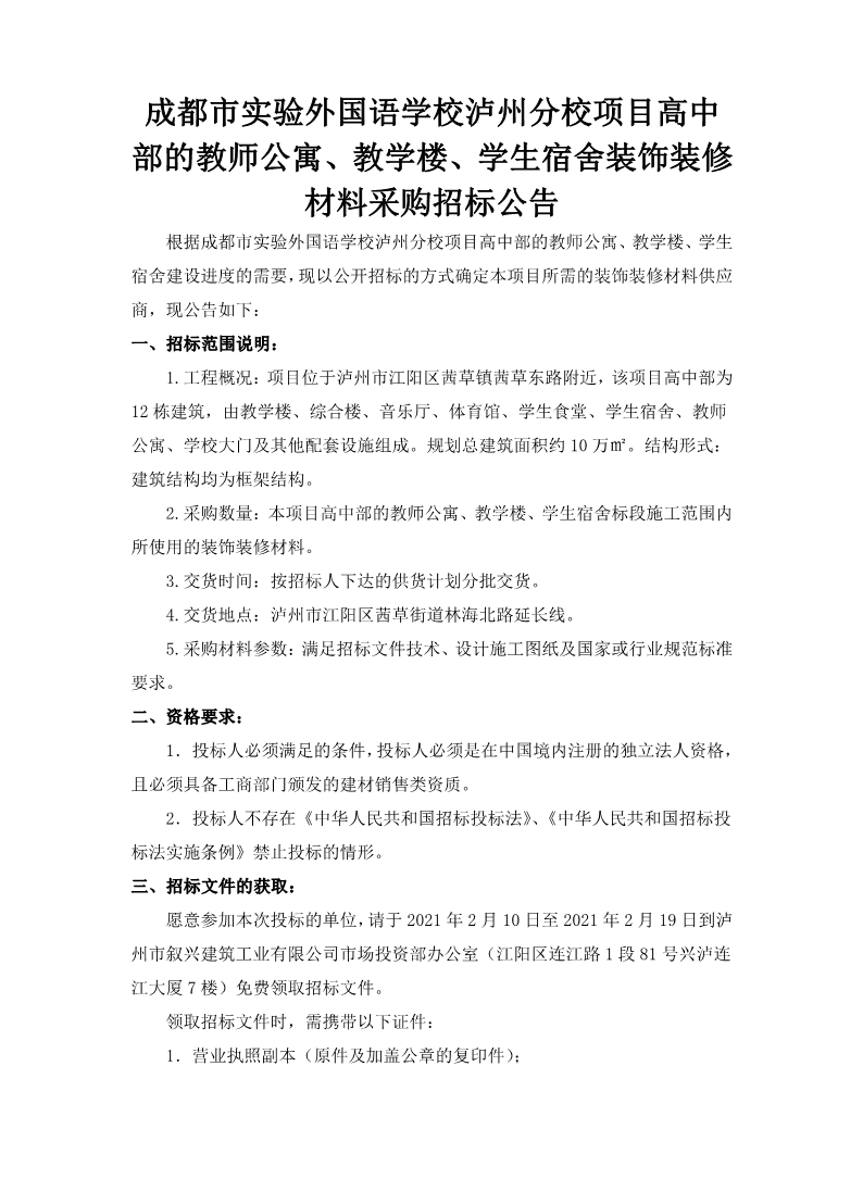 成都市實驗外國語學校瀘州分校項目高中部的教師公寓、教學樓、學生宿舍裝飾裝修材料采購招標公告
