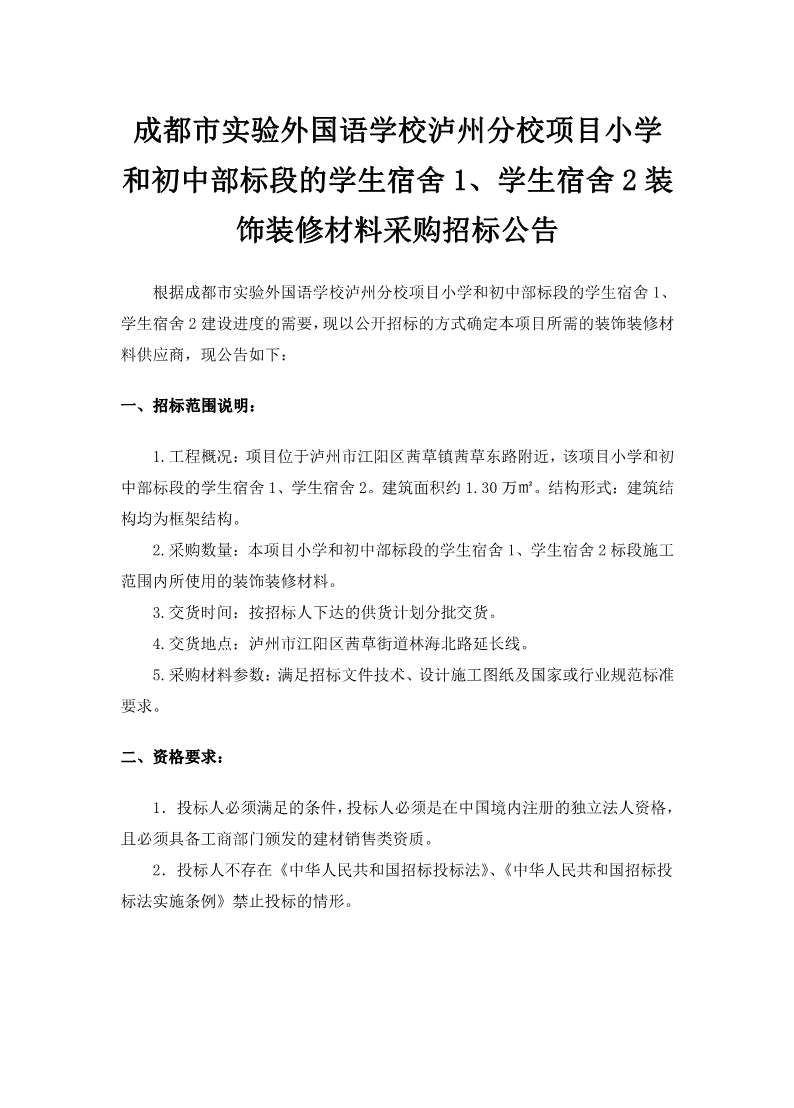 成都市實(shí)驗(yàn)外國(guó)語(yǔ)學(xué)校瀘州分校項(xiàng)目小學(xué)和初中部標(biāo)段的學(xué)生宿舍、學(xué)生宿舍2裝飾裝修材料采購(gòu)招標(biāo)公告