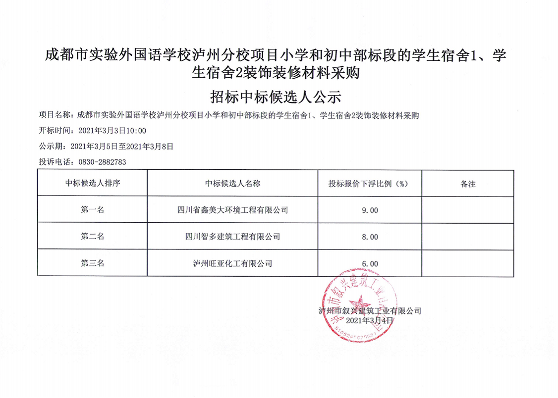 成都市實(shí)驗(yàn)外國(guó)語(yǔ)學(xué)校瀘州分校項(xiàng)目小學(xué)和初中部標(biāo)段的學(xué)生宿舍1、學(xué)生宿舍2裝飾裝修材料采購(gòu)招標(biāo)中標(biāo)候選人公示