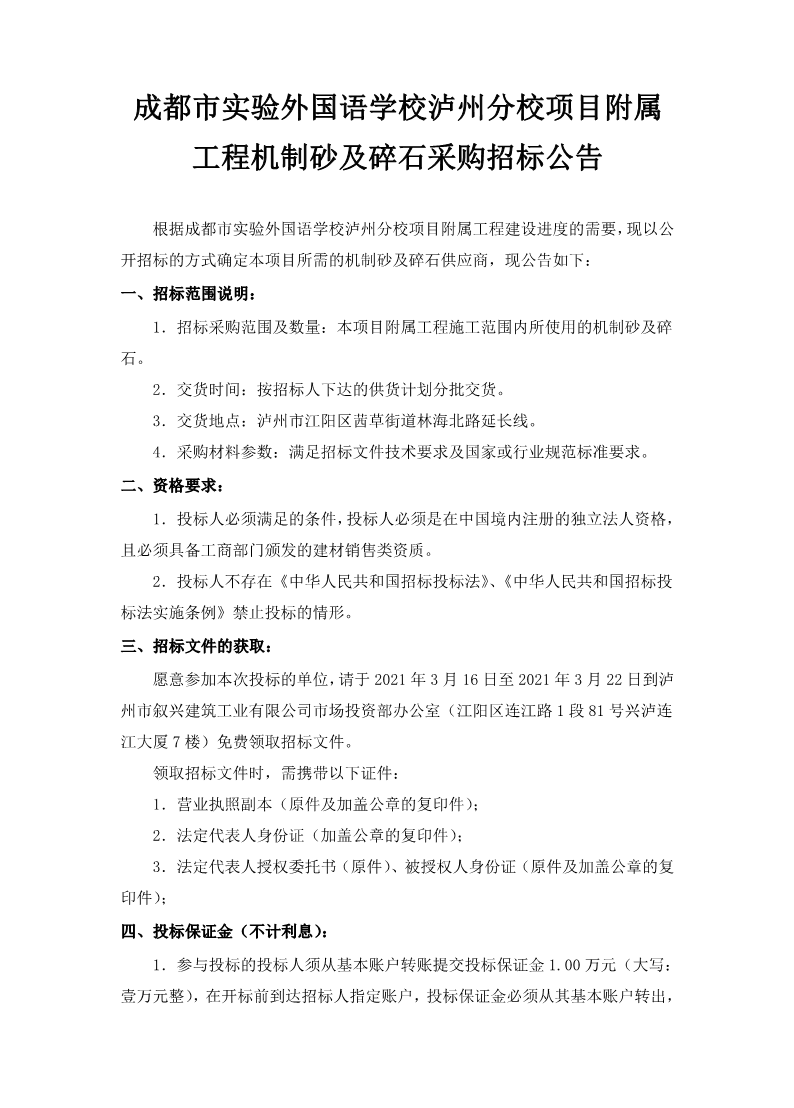 成都市實(shí)驗(yàn)外國(guó)語(yǔ)學(xué)校瀘州分校項(xiàng)目附屬工程機(jī)制砂及碎石采購(gòu)招標(biāo)公告 作者: 來(lái)源: 日期:2021-03-15 瀏覽次數(shù): 次 【字體:小 大】 【打印正文】