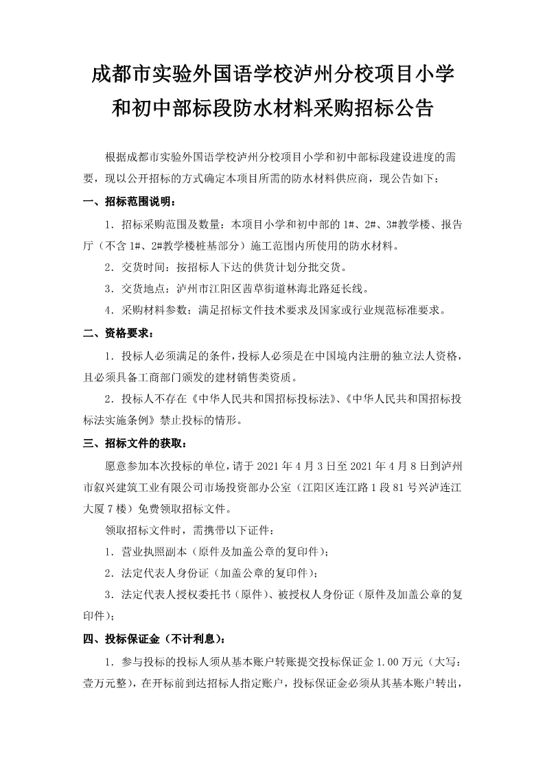 成都市實(shí)驗(yàn)外國語學(xué)校瀘州分校項(xiàng)目小學(xué)和初中部標(biāo)段防水材料采購招標(biāo)公告 作者: 來源: 日期:2021-04-02 瀏覽次數(shù): 次 【字體:小 大】 【打印正文】