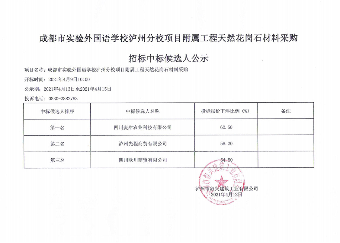 成都市實驗外國語學校瀘州分校項目附屬工程天然花崗石材料采購招標中標候選人公示