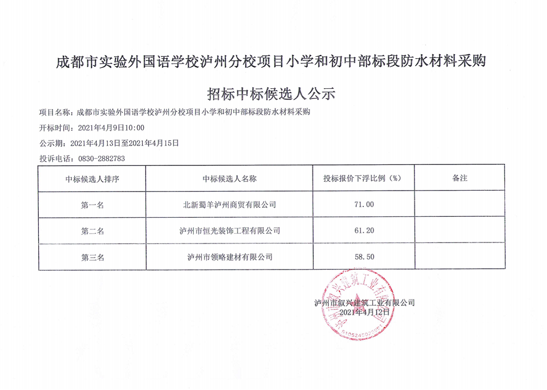成都市實驗外國語學(xué)校瀘州分校項目小學(xué)和初中部標(biāo)段防水材料采購招標(biāo)中標(biāo)候選人公示 作者: 來源: 日期:2021-04-12 瀏覽次數(shù): 次 【字體:小 大】 【打印正文】