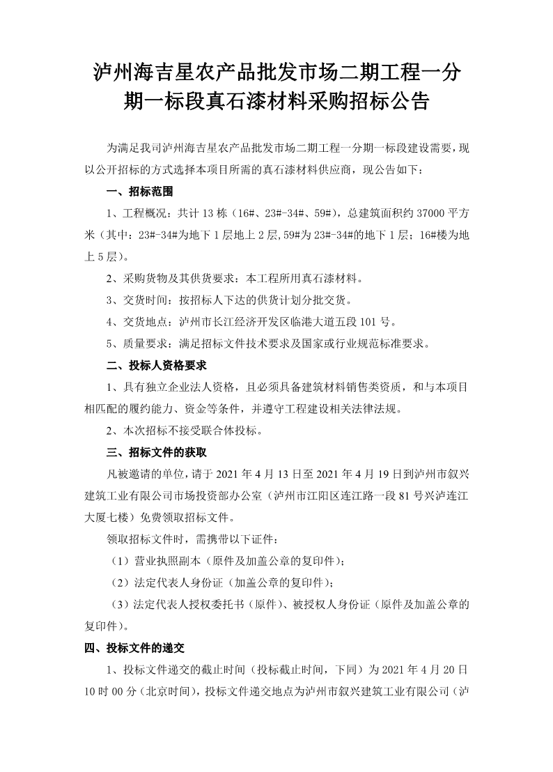 瀘州海吉星農(nóng)產(chǎn)品批發(fā)市場(chǎng)二期工程一分期一標(biāo)段真石漆材料采購(gòu)招標(biāo)公告 作者: 來(lái)源: 日期:2021-04-12 瀏覽次數(shù): 次 【字體:小 大】 【打印正文】