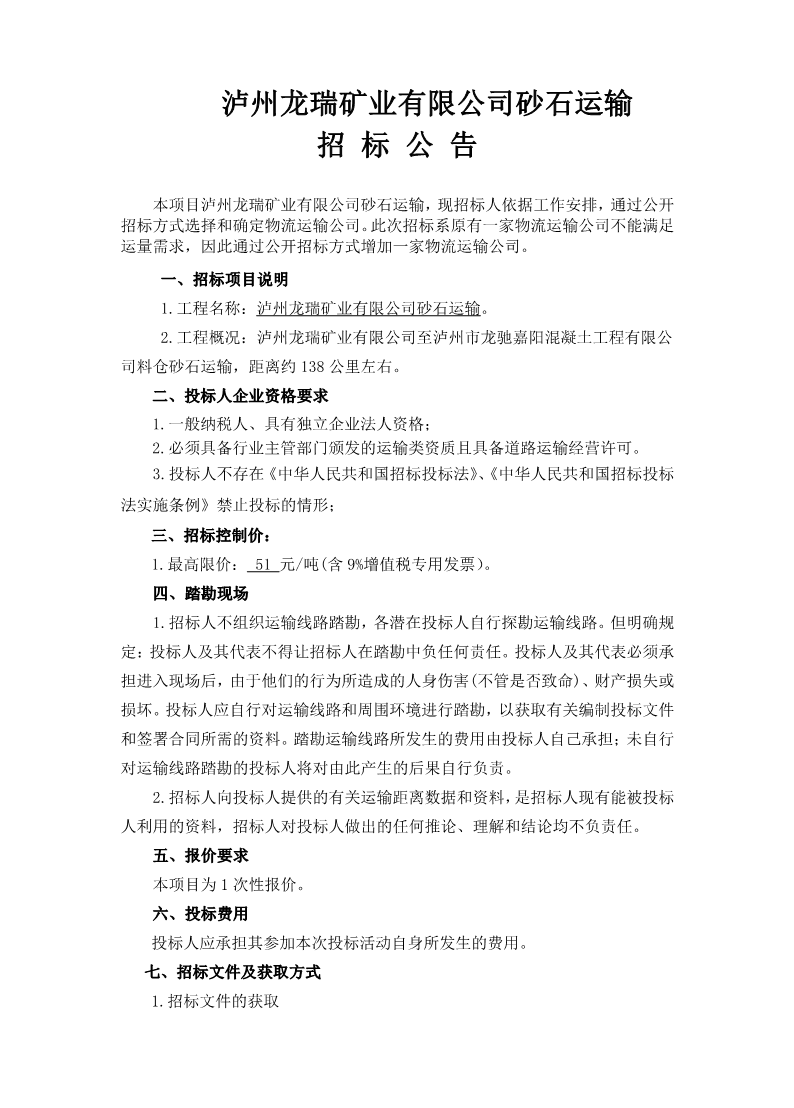 瀘州龍瑞礦業(yè)有限公司砂石運輸 招 標(biāo) 公 告(1)