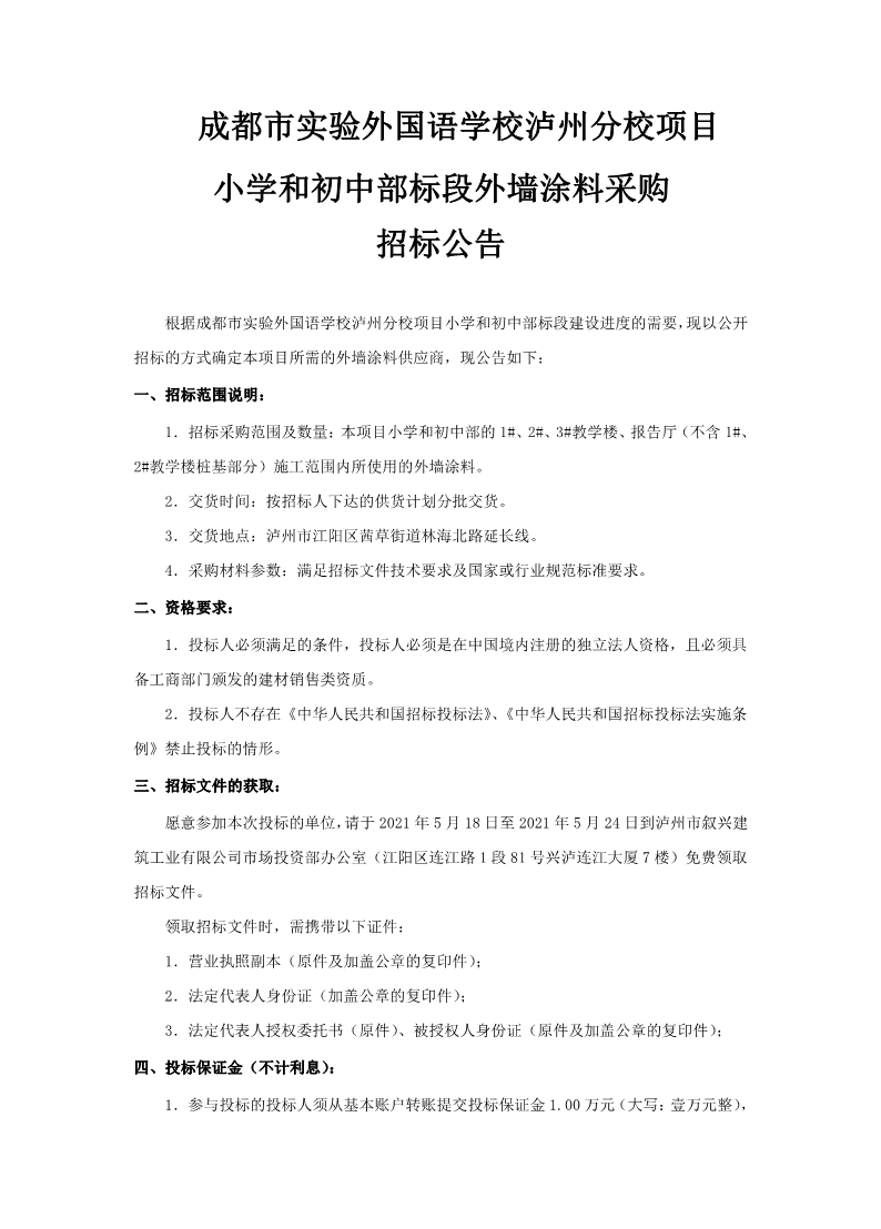 成都市實(shí)驗(yàn)外國(guó)語(yǔ)學(xué)校瀘州分校項(xiàng)目小學(xué)和初中部標(biāo)段外墻涂料采購(gòu)招標(biāo)公告 作者: 來(lái)源: 日期:2021-05-17 瀏覽次數(shù): 次 【字體:小 大】 【打印正文】