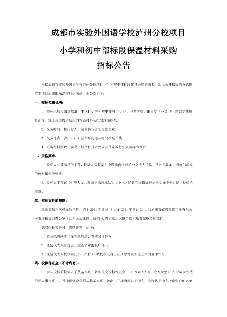成都市實驗外國語學校瀘州分校項目小學和初中部標段保溫材料采購招標公告