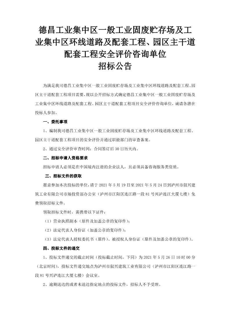 德昌工業(yè)集中區(qū)一般工業(yè)固廢貯存場及工業(yè)集中區(qū)環(huán)線道路及配套工程、園區(qū)主干道配套工程安全評價咨詢單位招標(biāo)公告 作者: 來源: 日期:2021-05-18 瀏覽次數(shù): 次 【字體:小 大】 【打印正文】