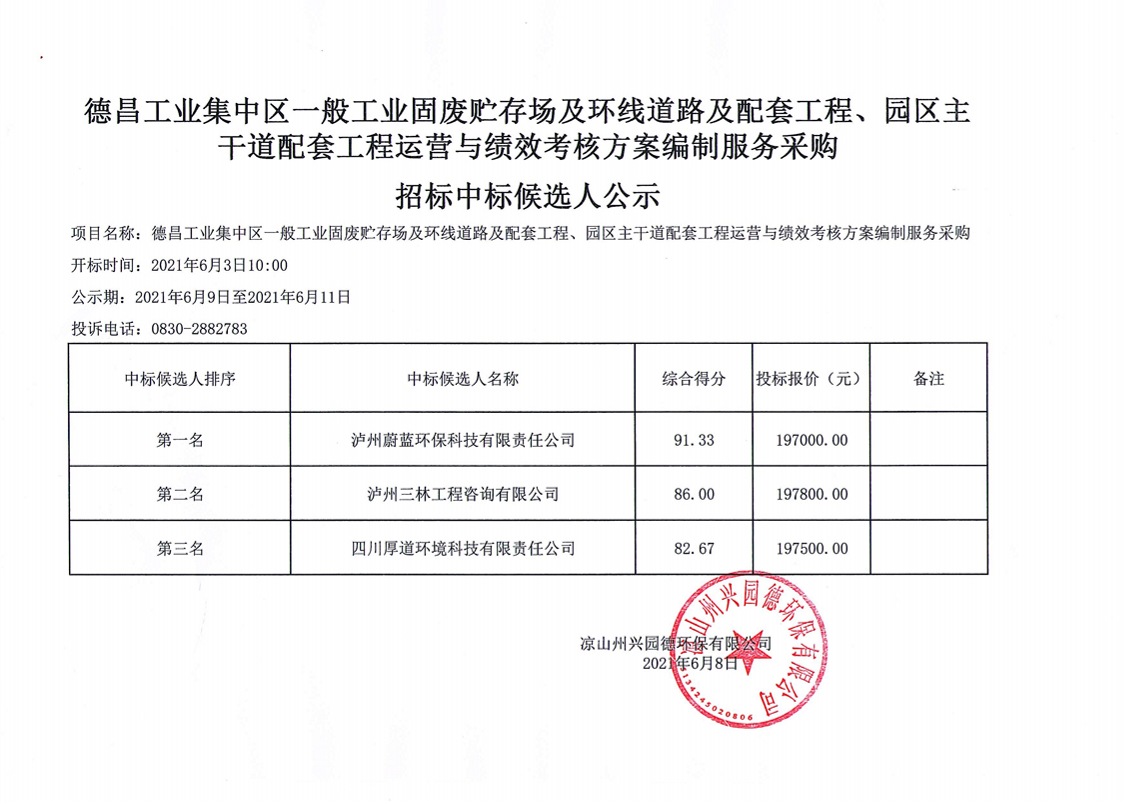 德昌工業(yè)集中區(qū)一般工業(yè)固廢貯存場(chǎng)及環(huán)線道路及配套工程、園區(qū)主干道配套工程運(yùn)營(yíng)與績(jī)效考核方案編制服務(wù)采購(gòu)招標(biāo)中標(biāo)候選人公示