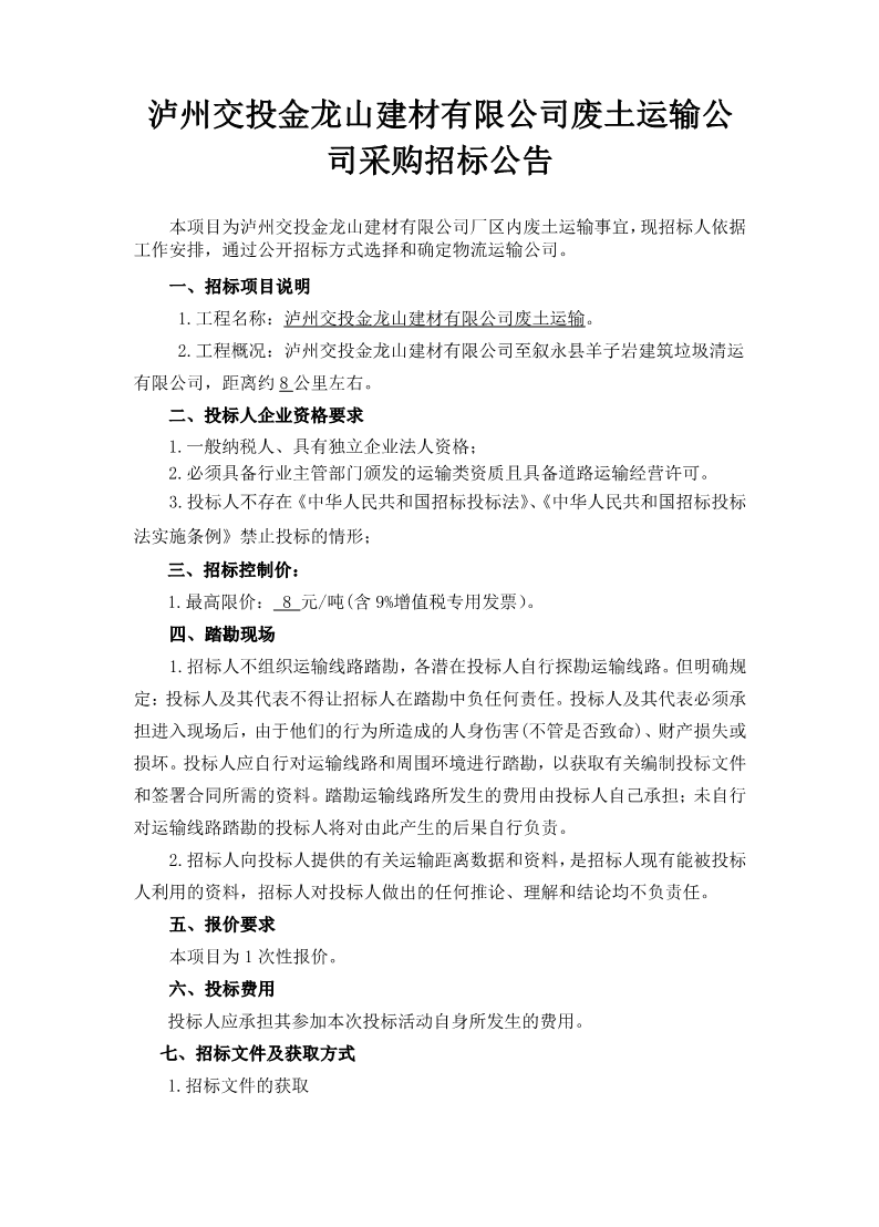 瀘州交投金龍山建材有限公司廢土運(yùn)輸公司采購招標(biāo)公告