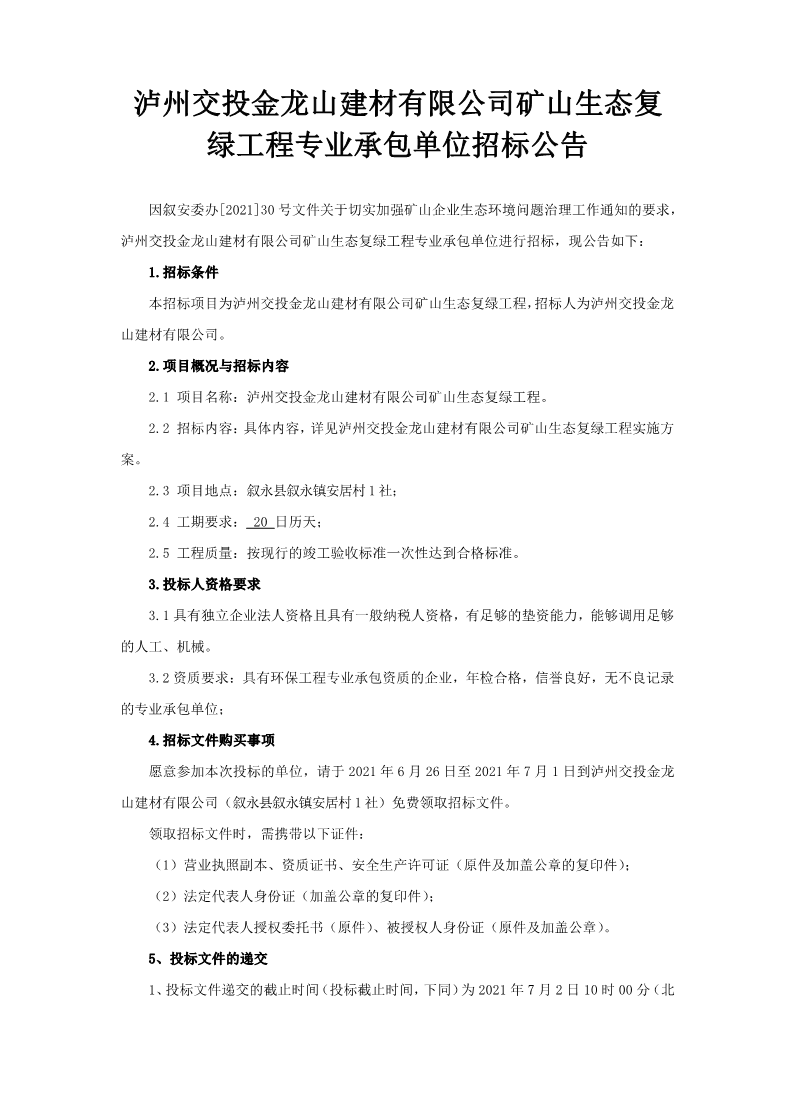 瀘州交投金龍山建材有限公司礦山生態(tài)復(fù)綠工程專業(yè)承包單位招標(biāo)公告 作者: 來源: 日期:2021-06-25 瀏覽次數(shù): 次 【字體:小 大】 【打印正文】