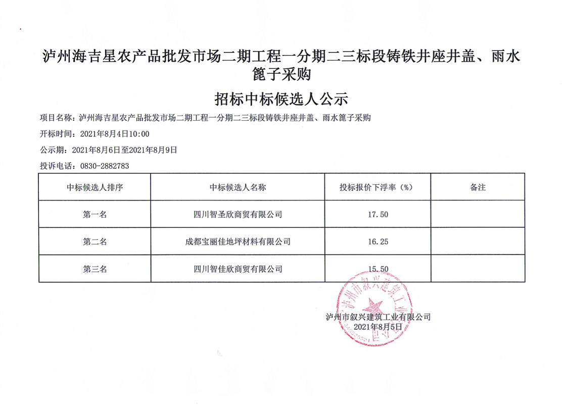 瀘州海吉星農(nóng)產(chǎn)品批發(fā)市場(chǎng)二期工程一分期二三標(biāo)段鑄鐵井座井蓋、雨水篦子采購招標(biāo)中標(biāo)候選人公示 作者: 來源: 日期:2021-08-05 瀏覽次數(shù): 次 【字體:小 大】 【打印正文】