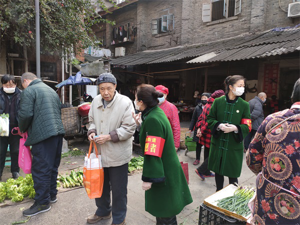 3月6日上午9點(diǎn),瀘州市南壽山實(shí)業(yè)發(fā)展有限責(zé)任公司13名女員工來(lái)到江陽(yáng)區(qū)藍(lán)田街道憲橋社區(qū)開(kāi)展疫情防控志愿服務(wù)活動(dòng)。此次活動(dòng)分為3個(gè)小組,1個(gè)小組負(fù)責(zé)在菜市場(chǎng)入口檢測(cè)體溫,并在菜市場(chǎng)內(nèi)部巡邏督促商戶及群眾佩戴口罩,做好防護(hù)措施;其余2個(gè)小組負(fù)責(zé)巡街勸導(dǎo)市民群眾不要集中打堆,外出自覺(jué)佩戴口罩。